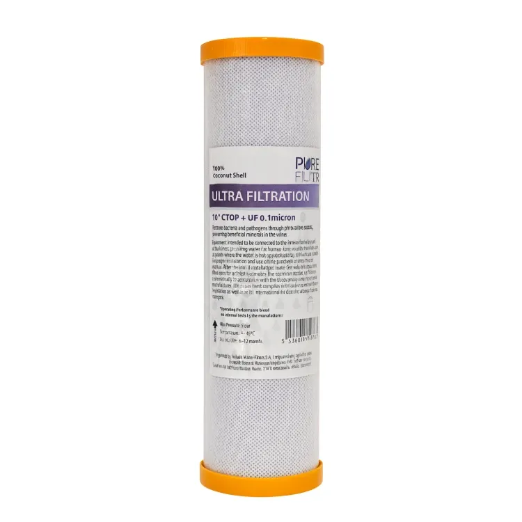 Το φίλτρο 10" CTO + UF 0,1 μm αποτελεί το τελικό στάδιο φιλτραρίσματος σε συστήματα καθαρισμού νερού, προσφέροντας υψηλό επίπεδο μηχανικής διήθησης. Η μεμβράνη υπερδιήθησης (UF) απομακρύνει βακτήρια και μικροσωματίδια έως 0.1 μm, ενώ ο ενεργός άνθρακας βελτιώνει τη γεύση και την οσμή του νερού.