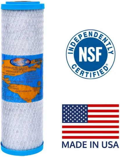 Φίλτρο νερού ενεργού, συμπαγούς άνθρακα (block) OMB934 -1M. Εξαιρετικής ποιότητας ενεργός (φαρμακευτικός) άνθρακας από κέλυφος καρύδας (coconut shell) με ονομαστική δυνατότητα φίλτρανσης 1 μικρού. Αφαιρεί χώμα, λάσπες, σκουριά, Χλώριο, δυσάρεστες γεύσεις & οσμές, Βαρέα μέταλλα, φυτοφάρμακα, πτητικές οργανικές ενώσεις (VOCs), επικίνδυνα χημικά, κύστες Cryptosporidium, Giardia, κτλ, ενώ η συμπαγής δομή του και η τεχνολογία κατασκευής (nanofiber) δεν επιτρέπει τη διαφυγή σωματιδίων στο νερό. Εφαρμογές σε οικιακά και επαγγελματικά συστήματα (πχ αντίστροφη όσμωση, κτλ), ψύκτες νερού, κ.ά. Πιστοποιημένο από το NSF (NSF/ANSI Standard 42)